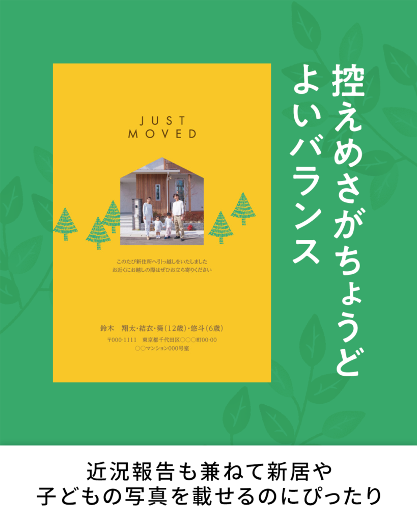 ✅お家の写真は載せづらいけど、写真入りで報告したい!そんな時はちょっとユニークに仕上がる「写真小さめタイプ」